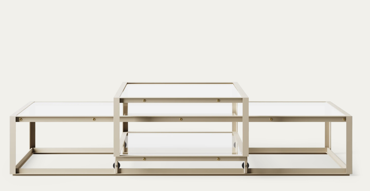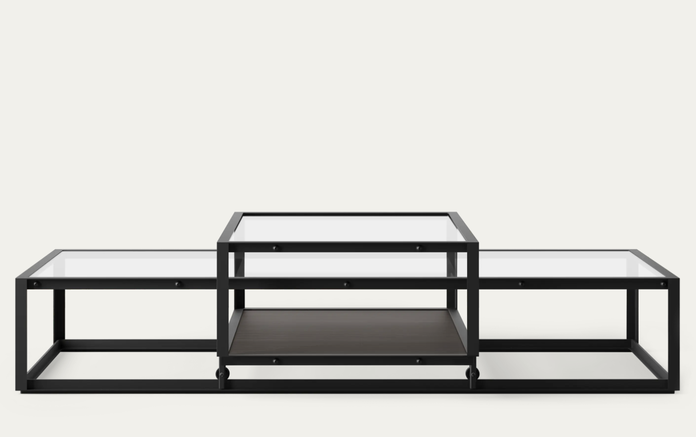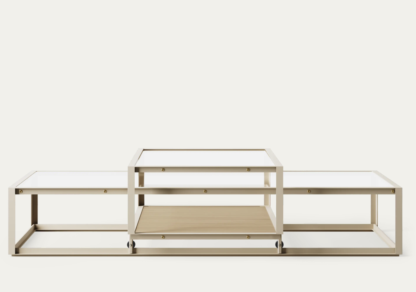 Der Couchtisch Tangled, entworfen von Carolina Wilcke, zeichnet sich durch einen architektonischen Rahmen mit raffinierten Details und einer sorgfältig ausgewogenen Komposition aus. Zwei ineinander verwobene Volumen verschmelzen zu einem harmonischen Ganzen, während die Glasplatten für Transparenz sorgen und auf drei Ebenen Platz für Accessoires bieten.