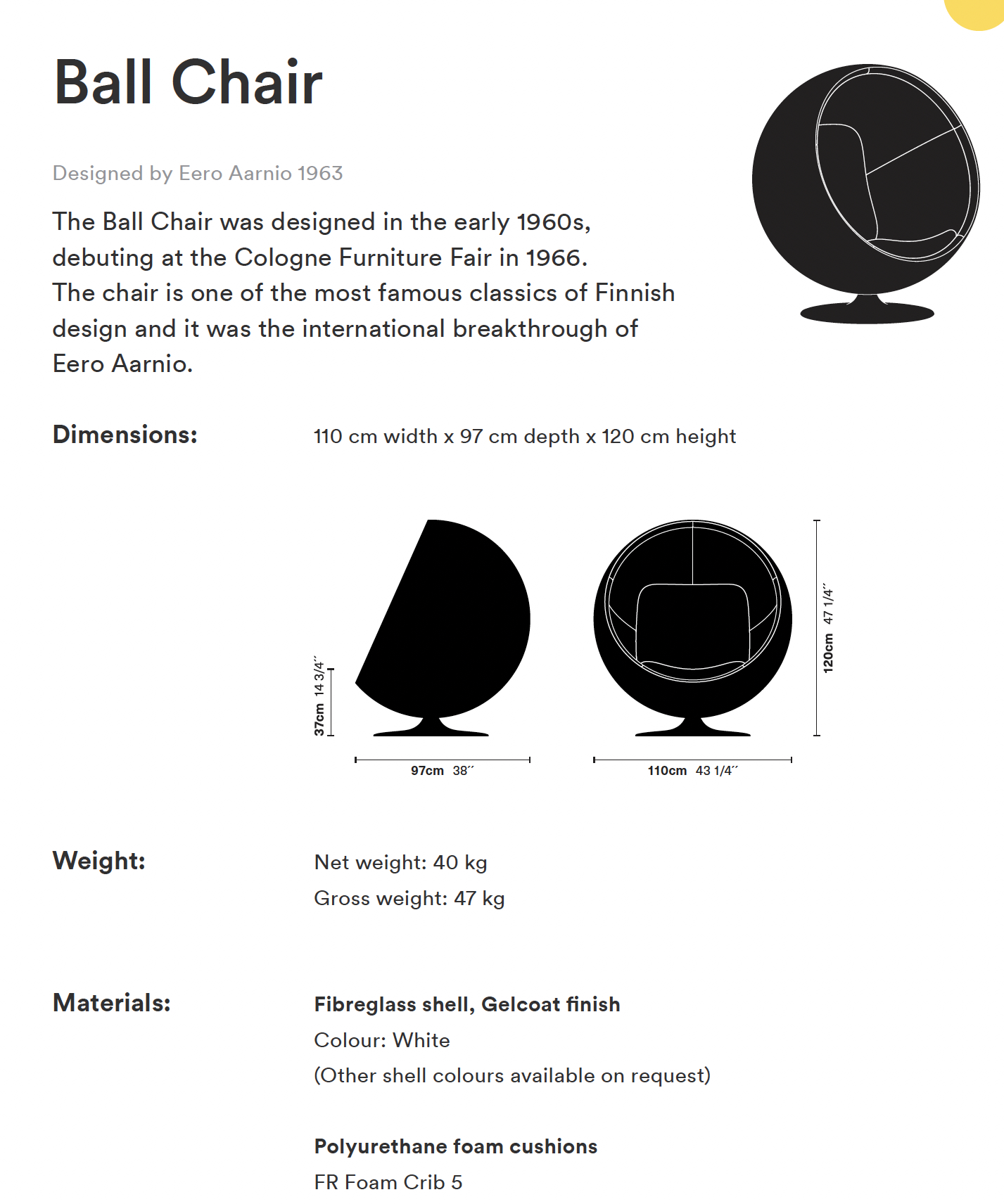 The icon of the 60´s! The famous ball easy chair by Eero Aarnio in fiberglass, white, inside fabric in different colours and combinations available (s. images), Ø 98 w 110 h 120 Sh 38 cm. Als available with seat in leather, black: 9.400,00 €.