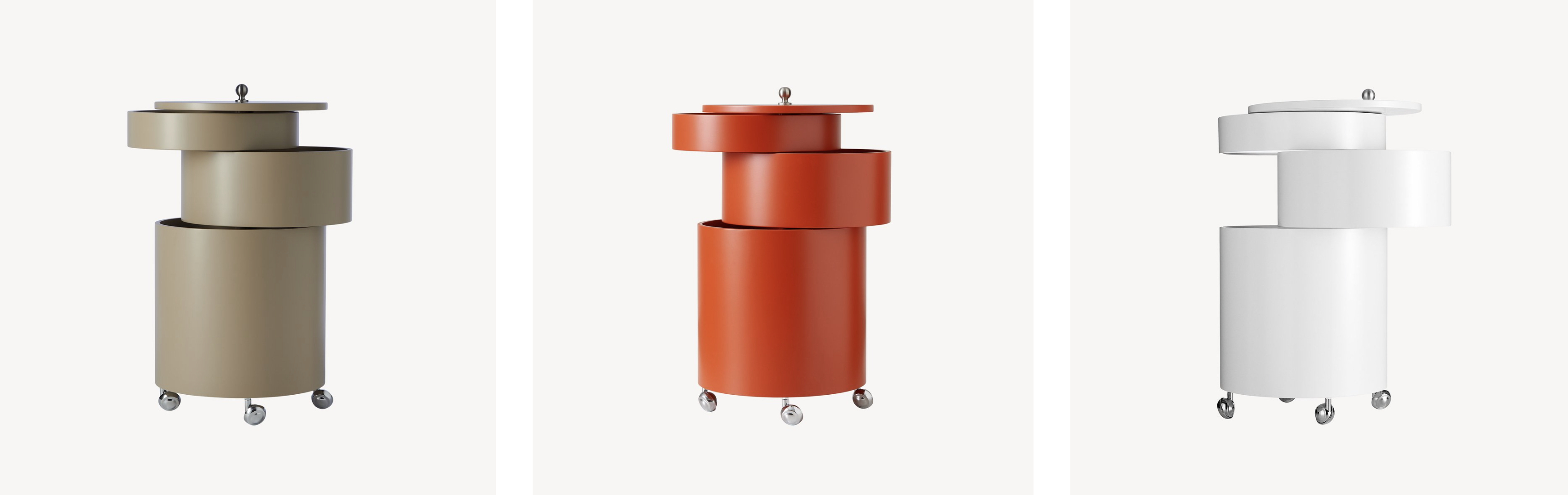 Barboy is a mobile storage piece produced in moulded wood, black or white and comprising four cylindrical parts. Two of the elements swing out to function as tables. Verner Panton designed Bar Boy in 1963 when he was living in Basel, Switzerland. During this period, Panton was particularly interested in designing furniture that allowed greater flexibility in the interior design and he often mounted his designs on wheels, Ø 38 h 72,5 cm.