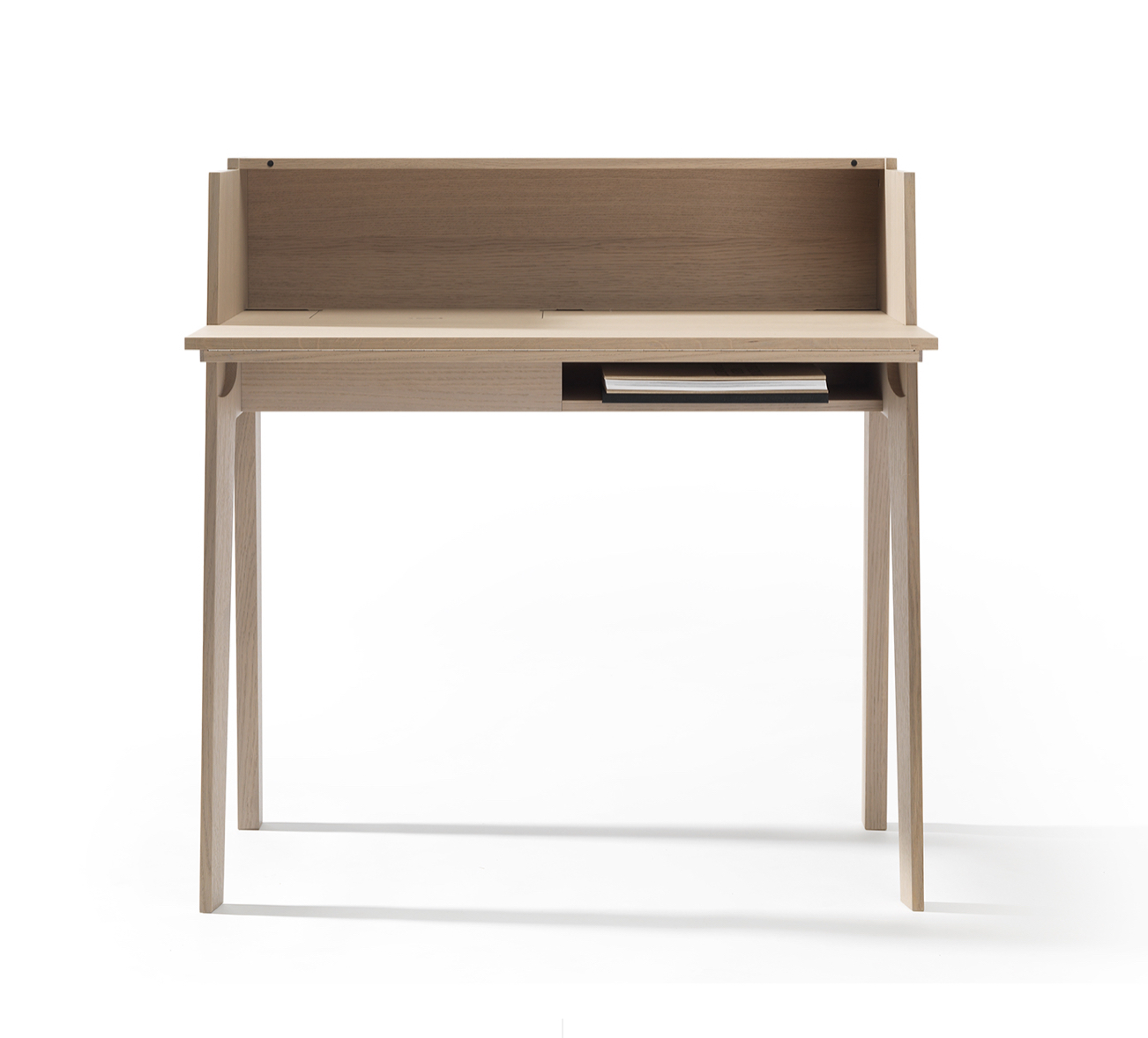 The graceful, yet functional desk. Here, Japanese form sensibility combines with the tradition of the writing-desk. A timeless model that will complement any furnishing style: it offers space for laptops of all sizes, cables and power supplies for electronic devices can be stored in a special compartment, even fountain pens and paper have their own place. AT-AT desk. Carcass, sides and feet in solid pear or oak stained black. Lid/desktop veneered in pear or oak stained black. Leather-lined recess for writing instruments, w 88 d 45,5 h 91,5 cm.