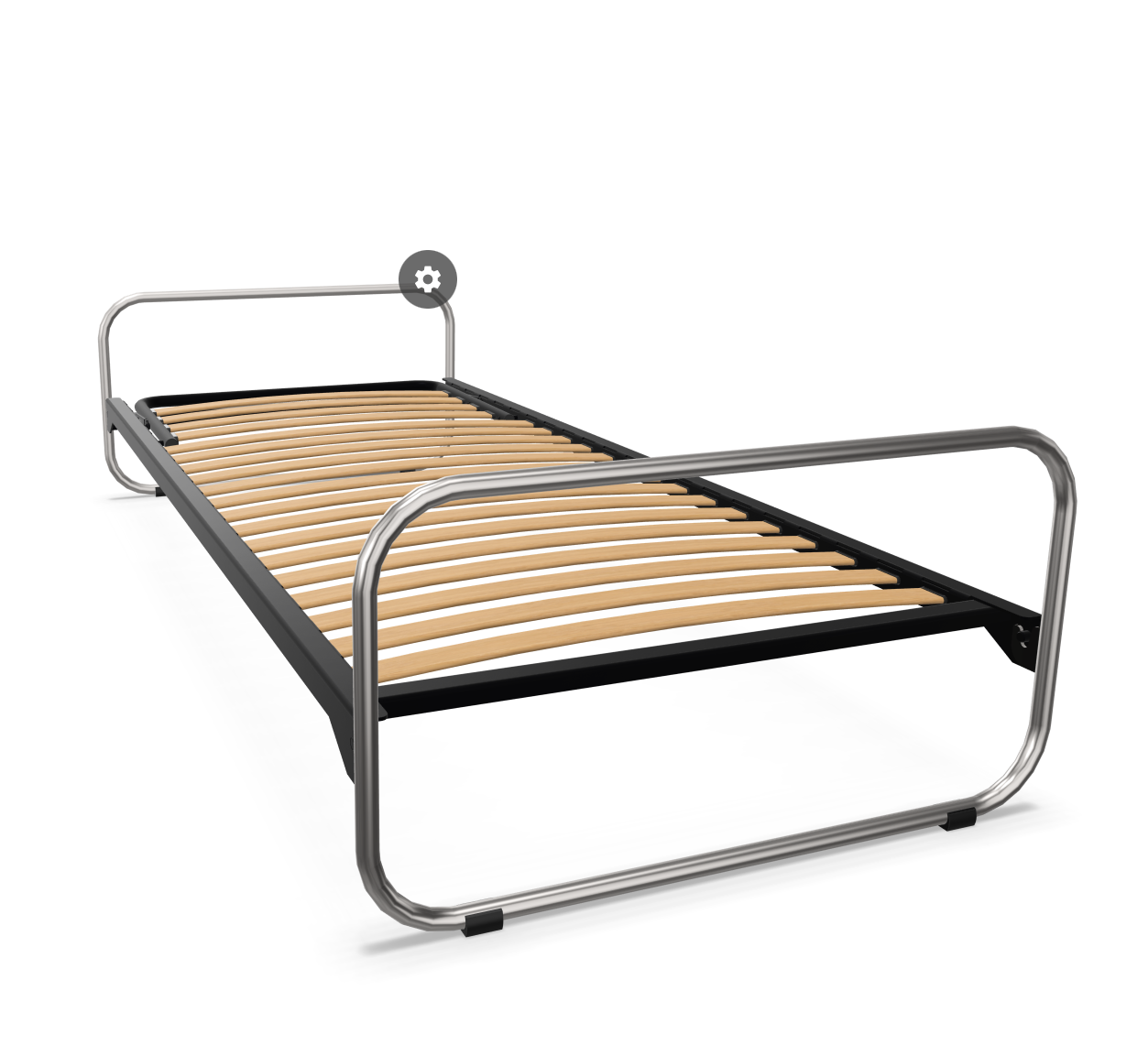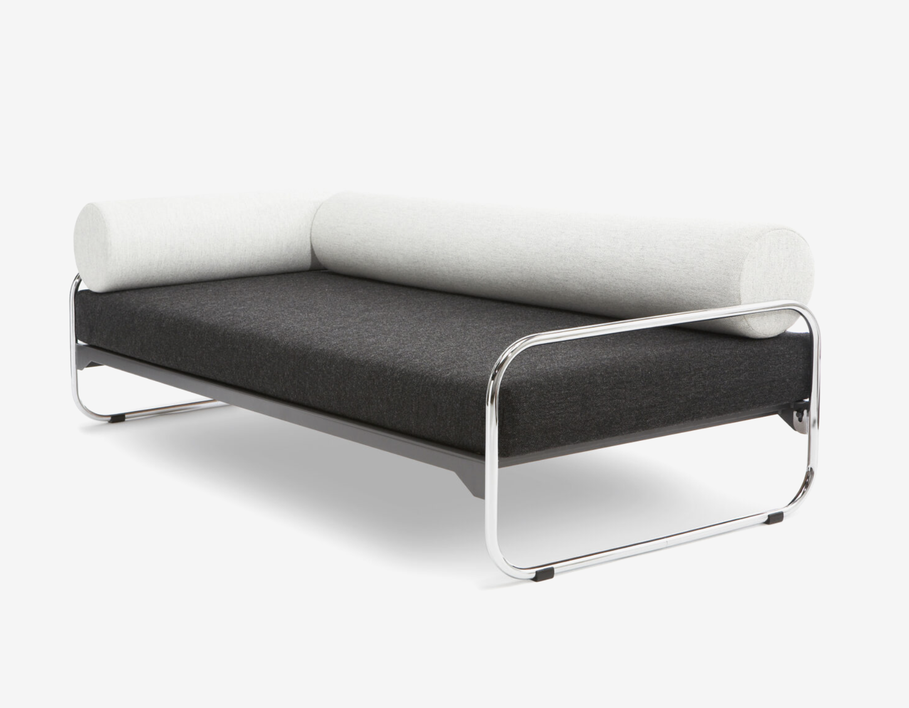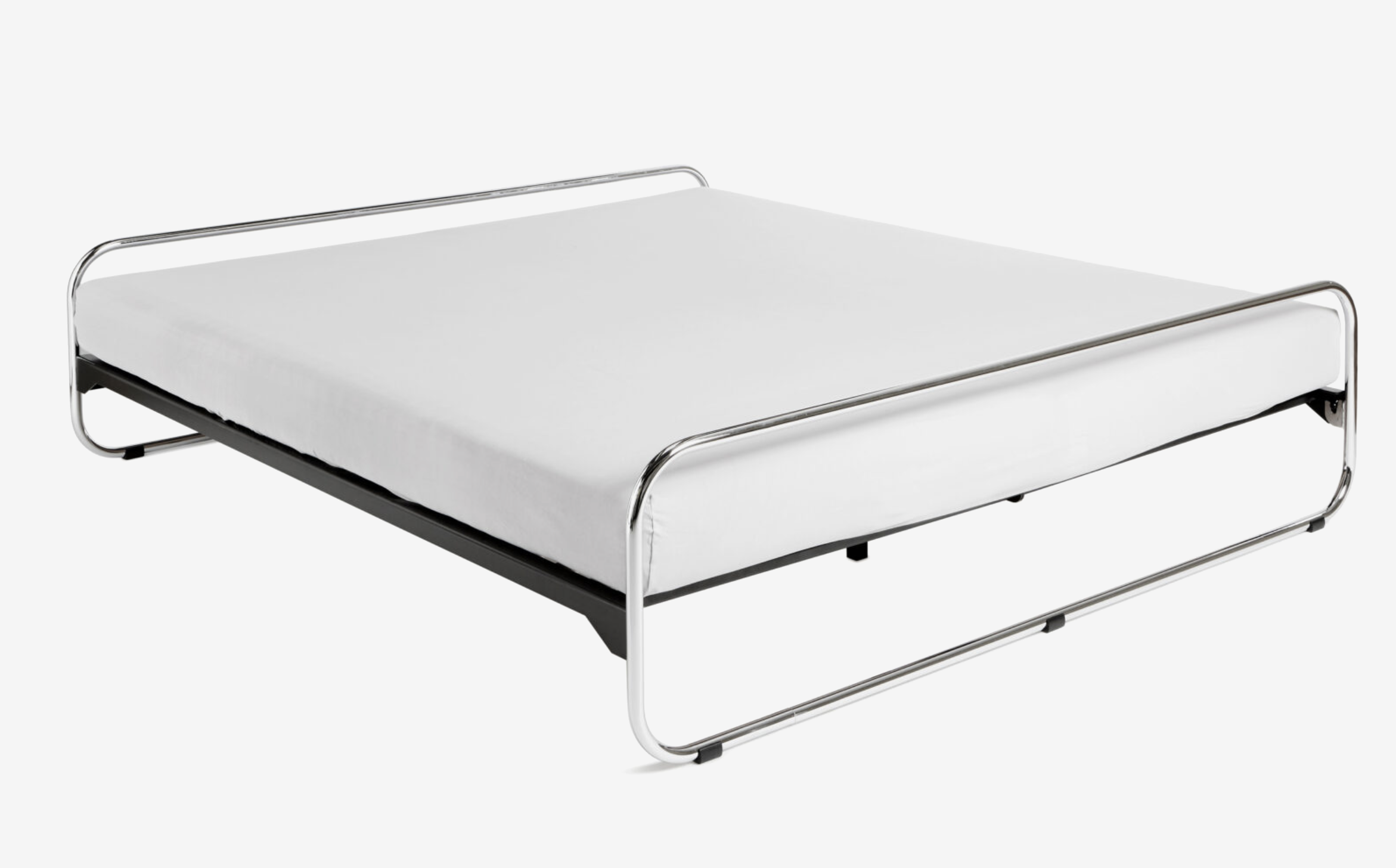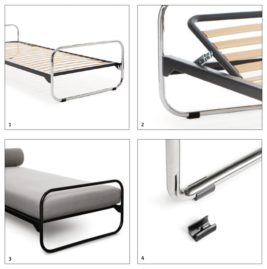 This resulted in the striking head and footboards made of polished chrome-plated tubular steel, which are a striking feature of this unadorned design. The slatted frame, which can be attached to the headboard without tools using a patented system, appears to float between them. The lying surface with head wedge adjustment can be equipped with an original spring mattress as well as side and neck rolls.