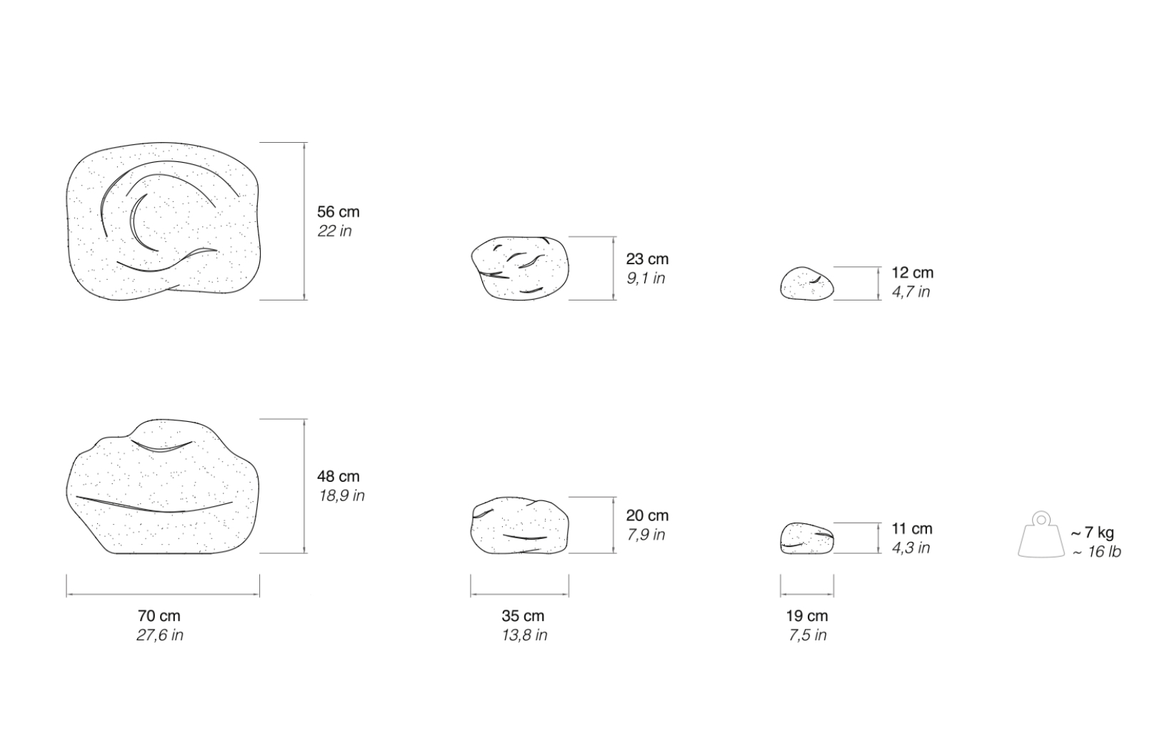 Nie sind ein Stein oder ein Felsen bequemer gewesen, als dieser. Diese weichen Steine aus Polyurethan sind seit 1972 auch Teil der ständigen Sammlung des Museum of Modern Art (MoMA) in New York. Abmessungen: 56 x 70 H 48 cm, 23 x 35 H 20 cm, 12 x 19 H 11 cm, limitierte Edition: 2000 Ex.