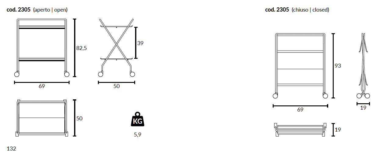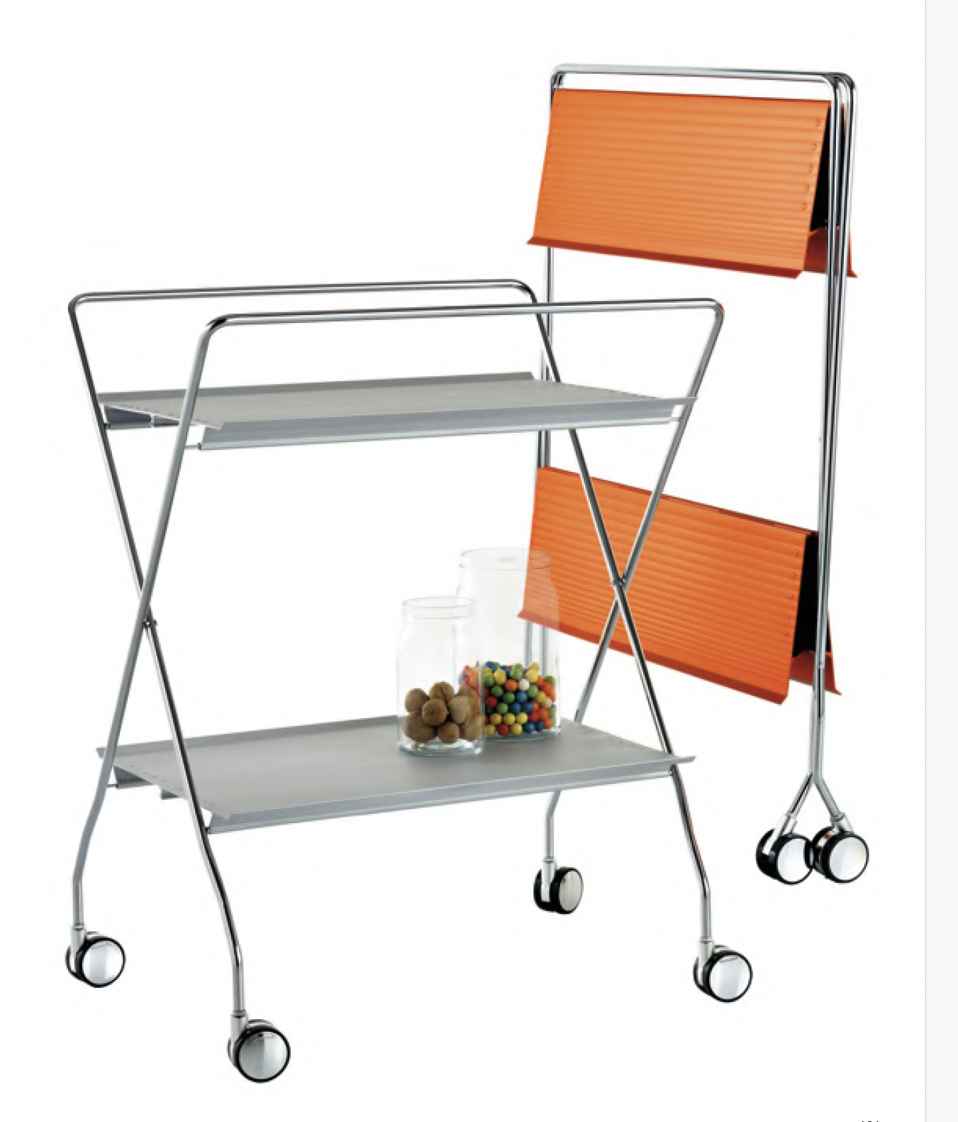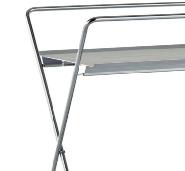 Klappbarer Servierwagen. Steht im zusammengeklappten Zustand selbstständig und nimmt nur 19 x H 93 cm Platz ein. Tabletts aus eloxiertem stranggepresstem Aluminium, naturbelassen oder lackiert. Gestell aus verchromtem Stahl.