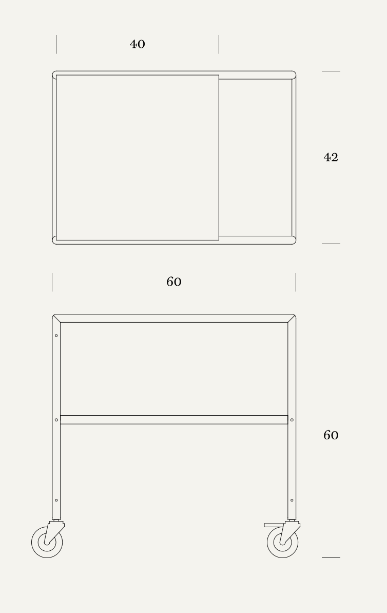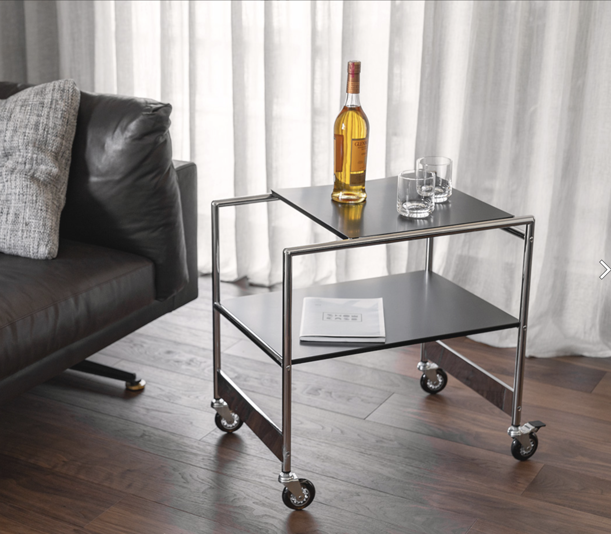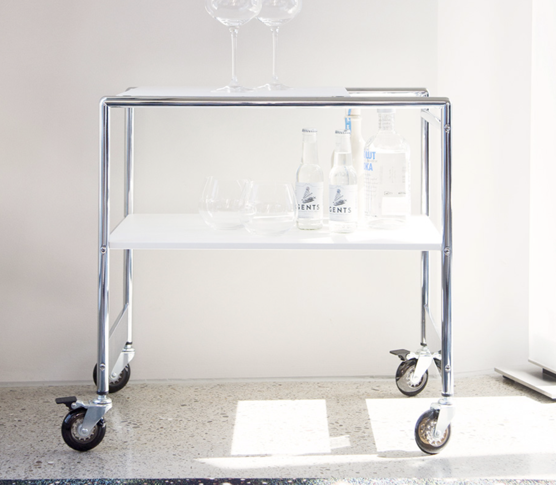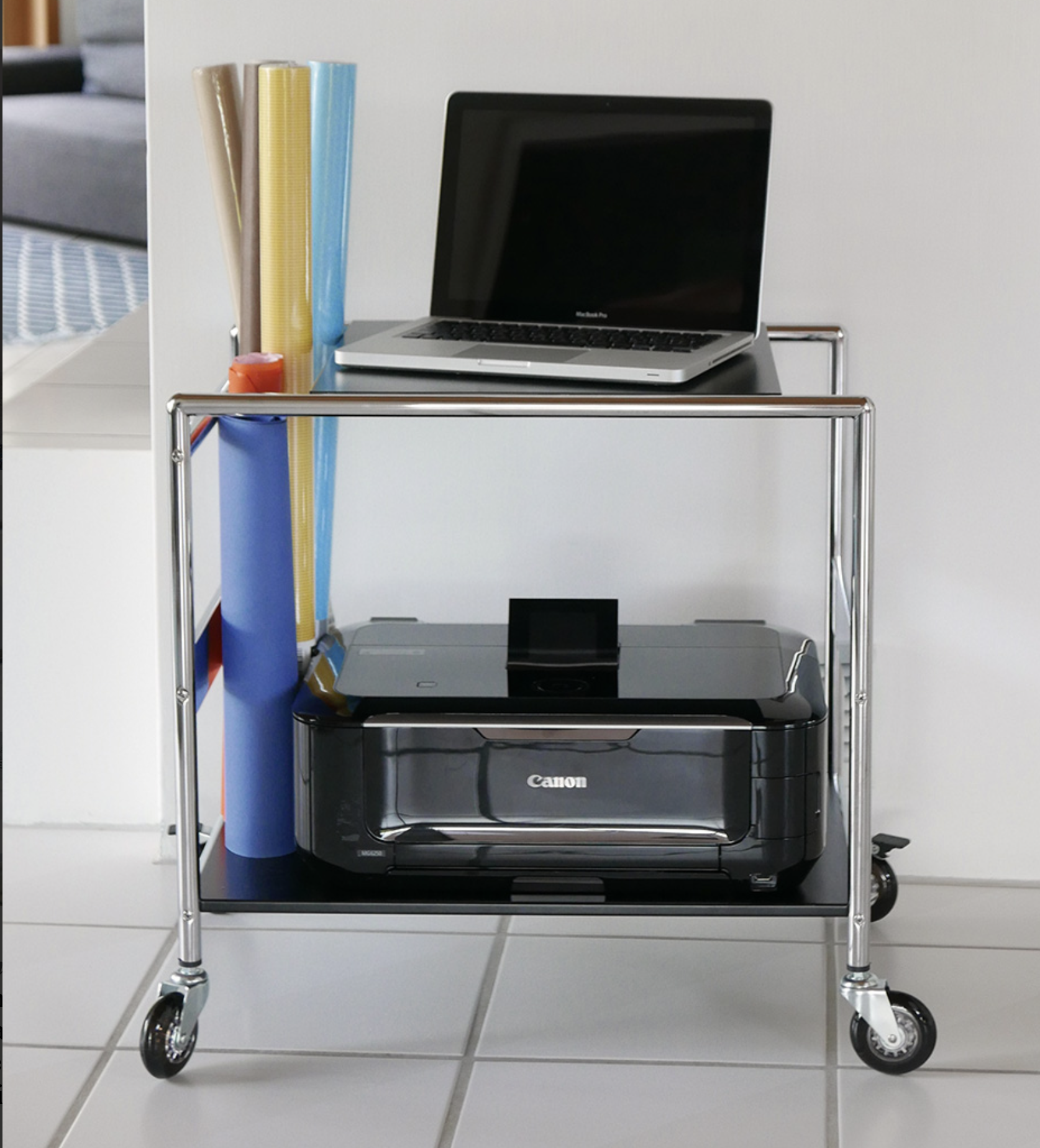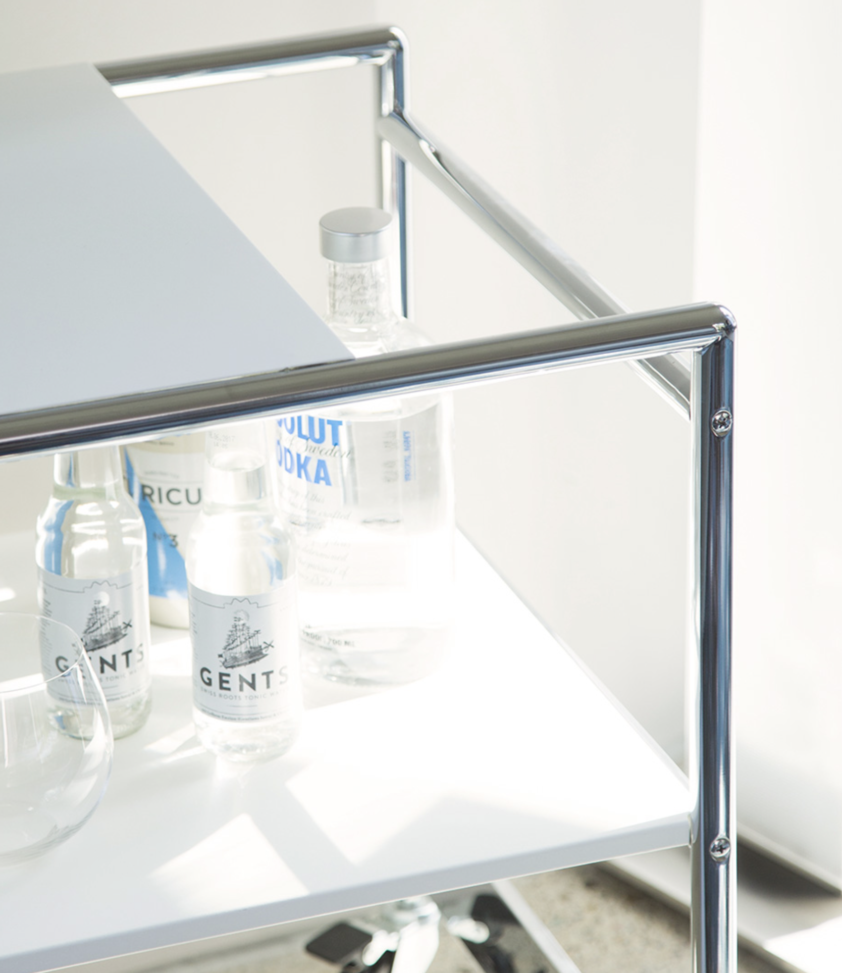 Zu Diensten Der kleine Servierwagen SIR steht auf vier leichtgängigen und hochwertigen Inliner-Rollen. Dadurch lässt er sich leicht über jeden Bodenbelag bewegen und bleibt auch am Teppich nicht hängen. Das obere Tablare ist aufgelegt und kann leicht anders positioniert werden. Das untere Tablar kann an zwei verschiedenen Stellen montiert werden. Ein kompaktes Rollmöbel, geeignet im Wohnzimmer als Hausbar oder Beistelltisch, im Homeoffice für Drucker und Schreibwaren oder im Badezimmer für Frottiertücher und allerlei.