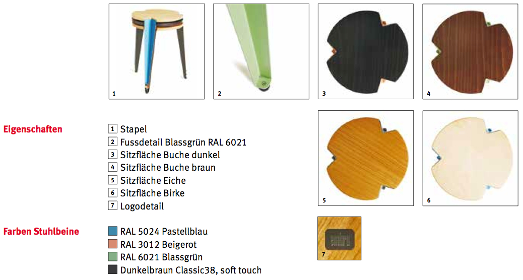 Produkt-Details: Sitzfläche Multiplex, Buche gebeizt, Birke naturlackiert oder Eiche naturlackiert, Stuhlbeine Stahlblech, pastellblau, beigerot, blassgrün oder dunkelbraun classic, Gleiter Kunststoff, Filz oder PVC, B 41,5 T 41,5 H 44,7 cm, Sitzfläche Ø 36 cm, stapelbar bis max. 10 Stk.